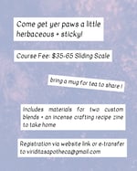 Join herbalist and medicinal herb farmer Marae in a hands-on workshop crafting hand-rolled incense cones and stovetop-blended compound incense slabs. We will making blends with locally grown and farm-direct herbs, berries, roots, juices, fruit, floral waters, herb resins and honey (vegan alternatives available) Participants will learn blending and shaping methods and take their custom cones and slabs home to cure.