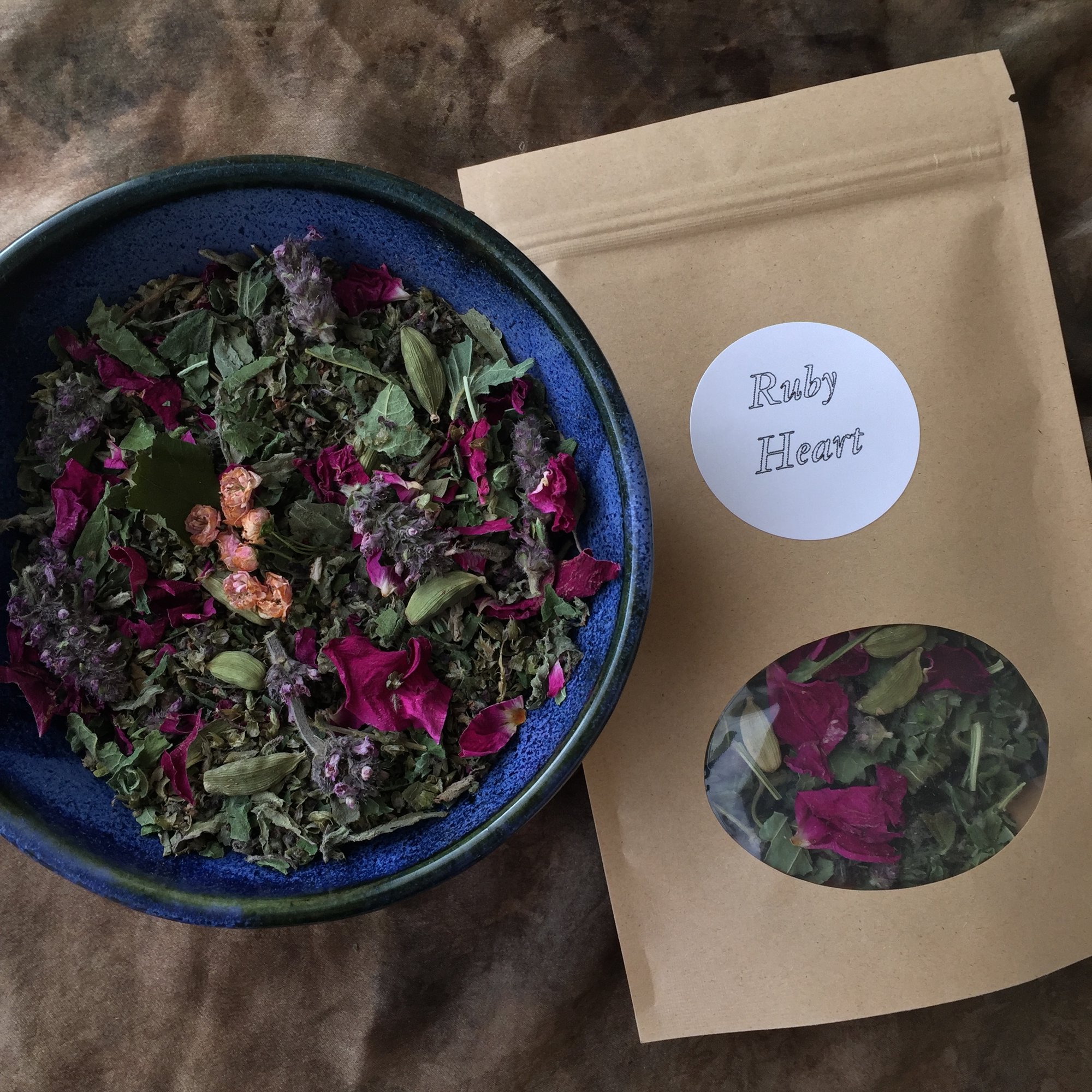 Farm grown tulsi, rose petals, farm direct wood betony, wild harvested hawthorne flower and leaves, certified organic green cardamom pods. Sweet and a bit spicy.